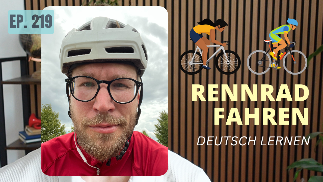 (0:23) Ich glaube, viele Leute fahren mit dem Rennrad, sind mit dem Rennrad unterwegs oder fahren (0:27) einfach nur Fahrrad und dann fährst du so mit deinem Fahrrad und stellst fest, ja, wie (0:36) nennt man denn das oder wie nennt man denn das Teil oder was hat jetzt da mein Kumpel (0:42) gesagt im Windschatten? (0:44) Naja, und mit solchen Wörtern oder mit so einem Satzbaustein beschäftigen wir uns heute. (0:51) Also erstmal schauen wir uns ein paar Teile an, Fahrradteile oder irgendwie so, ja, Dinge, (0:58) die du benötigst und im zweiten Teil schauen wir uns dann so alltägliche Begriffe oder (1:05) Phrasen an, die wir so verwenden, gerade die Muttersprachler verwenden, die du aber vielleicht (1:11) nicht kennst, weil es irgendwie nicht sofort Sinn ergibt, wobei Windschatten ergibt sogar (1:16) eigentlich Sinn, ein bisschen zumindest. (1:18) Da gibt es noch so ein paar andere Wörter, Wortgruppen, die nicht so ganz klar sind.